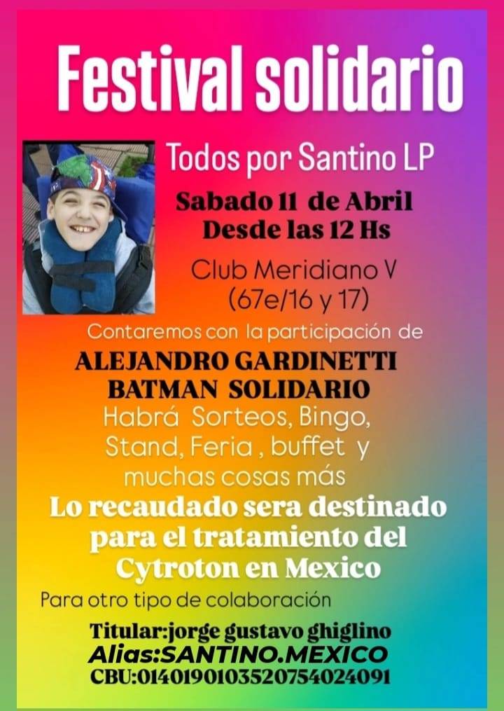 Con el lema "Todos por Santino", este sábado 11 de abril se realizará en el Club Meridiano V, en 67 entre 16 y 17, un festival en el que habrá sorteos, bingo, bufet, feria de expositores y muchas otras propuestas para colaborar con la causa de Santino.