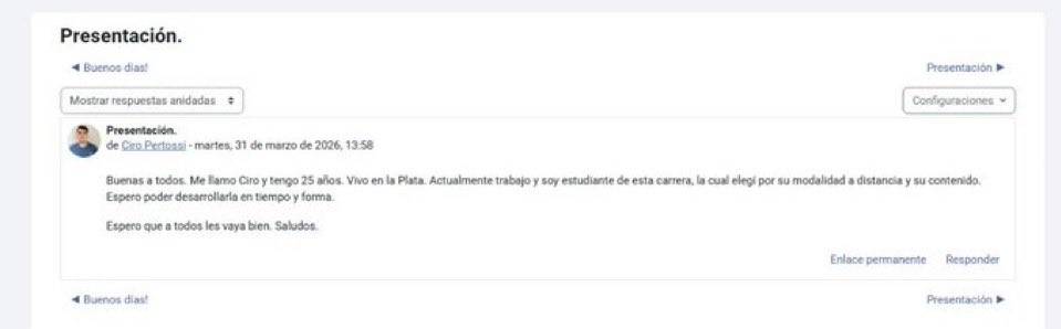 "Buenas a todos. Me llamo Ciro y tengo 25 años. Vivo en La Plata", fue el mensaje que escribió Ciro Pertossi, uno de los detenidos por el crimen de Fernando Báez Sosa, ayer por la tarde al momento de presentarse en una carrera universitaria. El joven estudia a distancia en una unidad académica de San Luis, pero los otros cuatro jóvenes detenidos por la muerte ocurrida en Villa Gesell en el verano de 2020, cursan de la misma forma desde Melchor Romero en una facultad de la Universidad Nacional de La Plata.