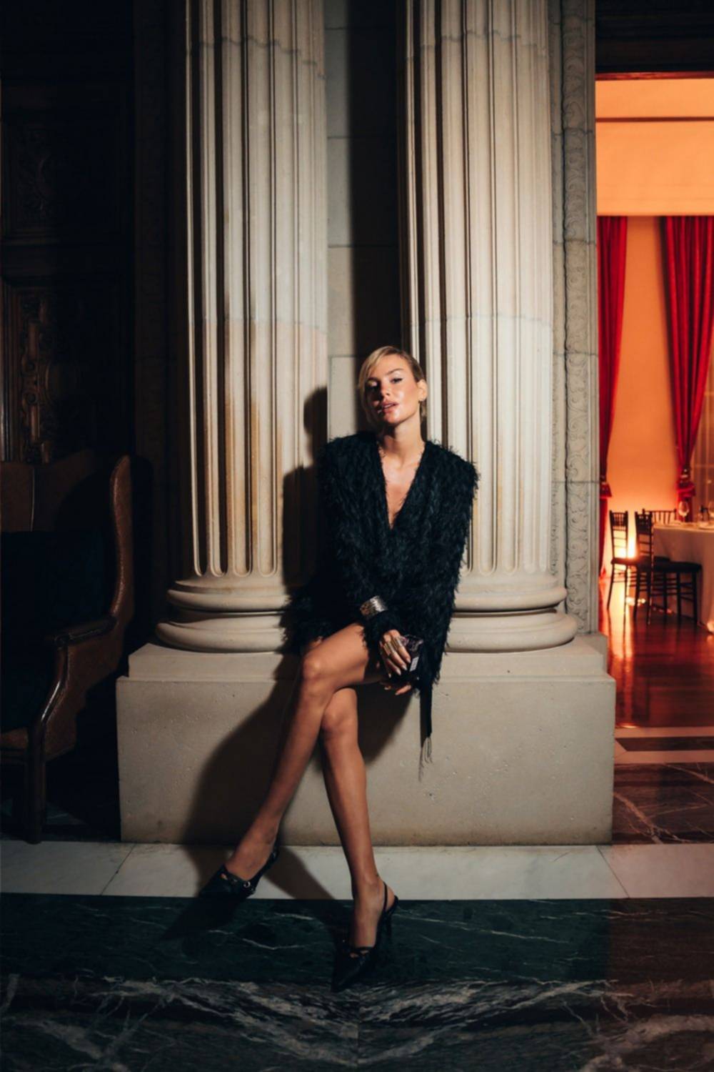 Eugenia De Martino se apoyó en una de las columnas del edificio, en un juego de luces y sombras / web