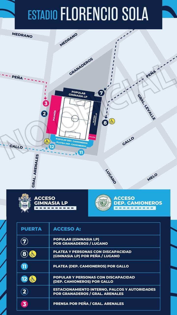 El público del Lobo se ubicará en la tribuna “Osvaldo Fani” y Tribuna “Eliseo Mouriño” con acceso por la intersección de las calles Peña y Lugano, Puertas N° 7 y 8. Se recomienda acceder al estadio desde la ciudad de La Plata Av. 122 y diagonal 74, subida Autopista Bs.As. – La Plata, bajar en Sarandí, tomar por Av. Nicaragua continuar por Av. Madariaga hasta Crisólogo Larralde, seguir por Coronel Linch hasta calle Roma, Granaderos, Cochabamba hasta Arenales y esta hacia el estadio.
